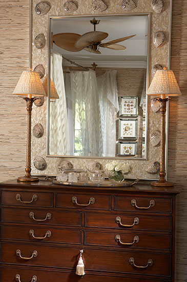 The mirror above the dresser is magnificent ! Framed with slivers of mother-of-pearl and a glimmer of crystals give the wall a dash of drama, a bit of sparkle, and lots of ROMANCE.