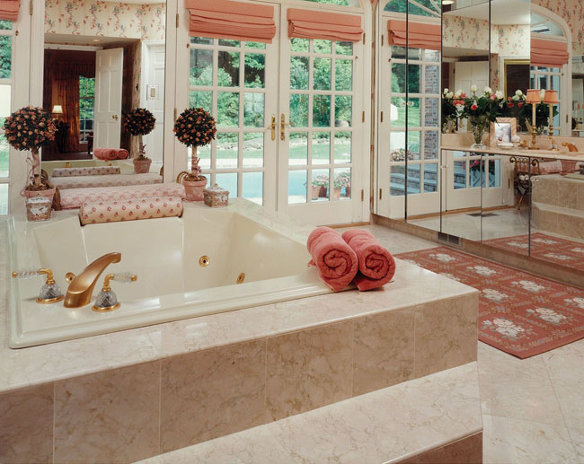 17 x 17' Master Bath space was chopped up with separate his/ hers ammenities ( his/hers Master closets and Dressing rooms). To achieve the drama and luxury appropriate for a home of this caliber, I converted this space into the one large glorious Boudoir Bath. By designing a separate HIS & HERS " SIDE " (each equipped with its own sink and cabinet space, vanity etc ) I achieved the symmetry that balances the room and offers the couple the separate spacial convenience that they requested requested.I added custom French doors leading to a beautiful pool/ outdoor living space.