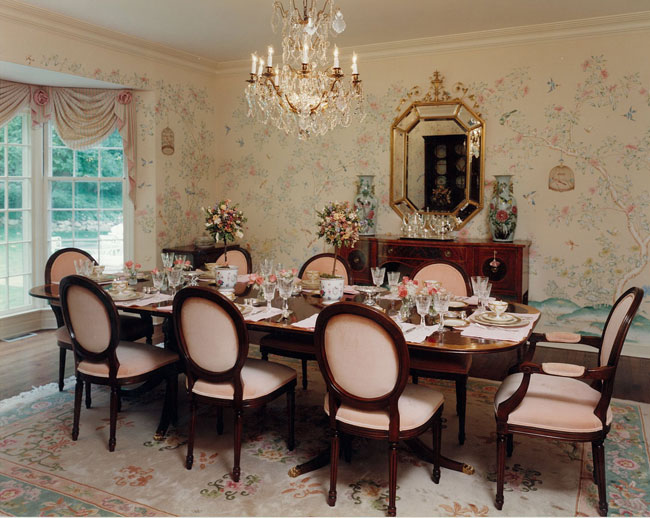 Probably the most special part of this Dining Room is the hand painted wall paper, which is actually custom made murals,of whose size I drew to scale to fit each wall elevation. Each panel is hand painted to my specifications. Due the preciousness of this paper, it is designed to be removed and re-installed if needed. This paper is truly crème de crème !