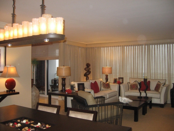Here we see a warm dining room at the Trump Towers. The Asian table setting, adds exotic flavor and works well with the clean lines of the space. Unfortunately, the fabulous Adriana Hoyos dining table, with its square recessed insert in the middle of the table top filled with natural seeds in warm earth tones, can not be fully seen or appreciated through the busyness of the table setting. Simple clean contemporary ultra suede chairs, mindful not to compete with the uniquity of the table are a perfect accompaniment