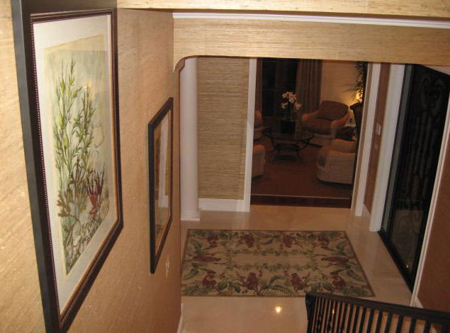 Of course a very textured grass cloth does the trick again! (Grass cloth has such diverse affects and can be used to eclectisize so many environments). The petit point wool carpet with tropical monkeys adds warmth and whimsy while bekoning you to enter. An Asian inspired hand carved wood statue on an Antique stand circa 1800 Elm/Shanxi, China gives you a sneak preview to the touches of exotisism that will prevail throughout the home.