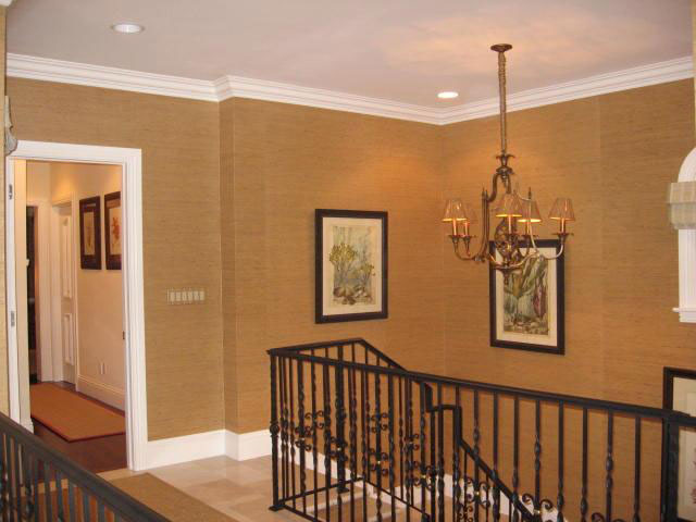 Of course a very textured grass cloth does the trick again! (Grass cloth has such diverse affects and can be used to eclectisize so many environments). The petit point wool carpet with tropical monkeys adds warmth and whimsy while bekoning you to enter. An Asian inspired hand carved wood statue on an Antique stand circa 1800 Elm/Shanxi, China gives you a sneak preview to the touches of exotisism that will prevail throughout the home.