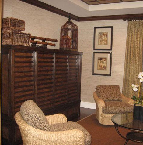 In accordance with my client's request for a more Unconventional Library floor plan, I rendered a cozy exotic haven using grass cloth to cover the walls. Repeating texture with the hyacynth sea grass swivel tub chairs set around a wok-inspired glass cocktail table, the stage was nearly set. All the moldings, doorways, and doors were faux-painted to imitate a rich dark Walnut grain, while I designed a vaulted ceiling effect using Walnut stained applied ceiling molding to mimic the geometric square motif commonly used in Asian designs. A darker granier grass cloth was effectively used inside these vaulted ceiling squares.