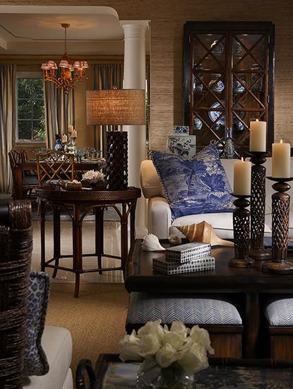 My presentation to the client utilized a plethora of primitive and casual elements with a touch of refined extravagence. Using the contrast of the very dark West Indian / South Pacific exotic woods ( mahogany, distressed walnut, rosewood, teak and rattan ) amidst a pure white linen sofa marked by blue and white linen tropical toile throw pillows added some drama to an otherwise laid- back room. The natural texture of banana leaf ( in the woven slipper chairs and ceiling fan ) combined with the natural shells in shadow boxes over the mantle marked the proximity to a beach!