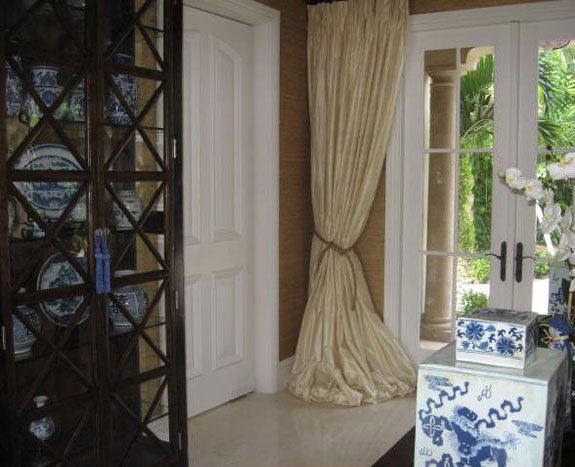Finally its the mingling of an over abundance of luxurious silk shantung fabric tied back with raw / natural sisal chord that draws your eye to a secluded Paradisean patio / pool area dripping with bouganvilla, and scented with jasmine and gardenias.
